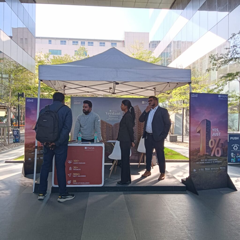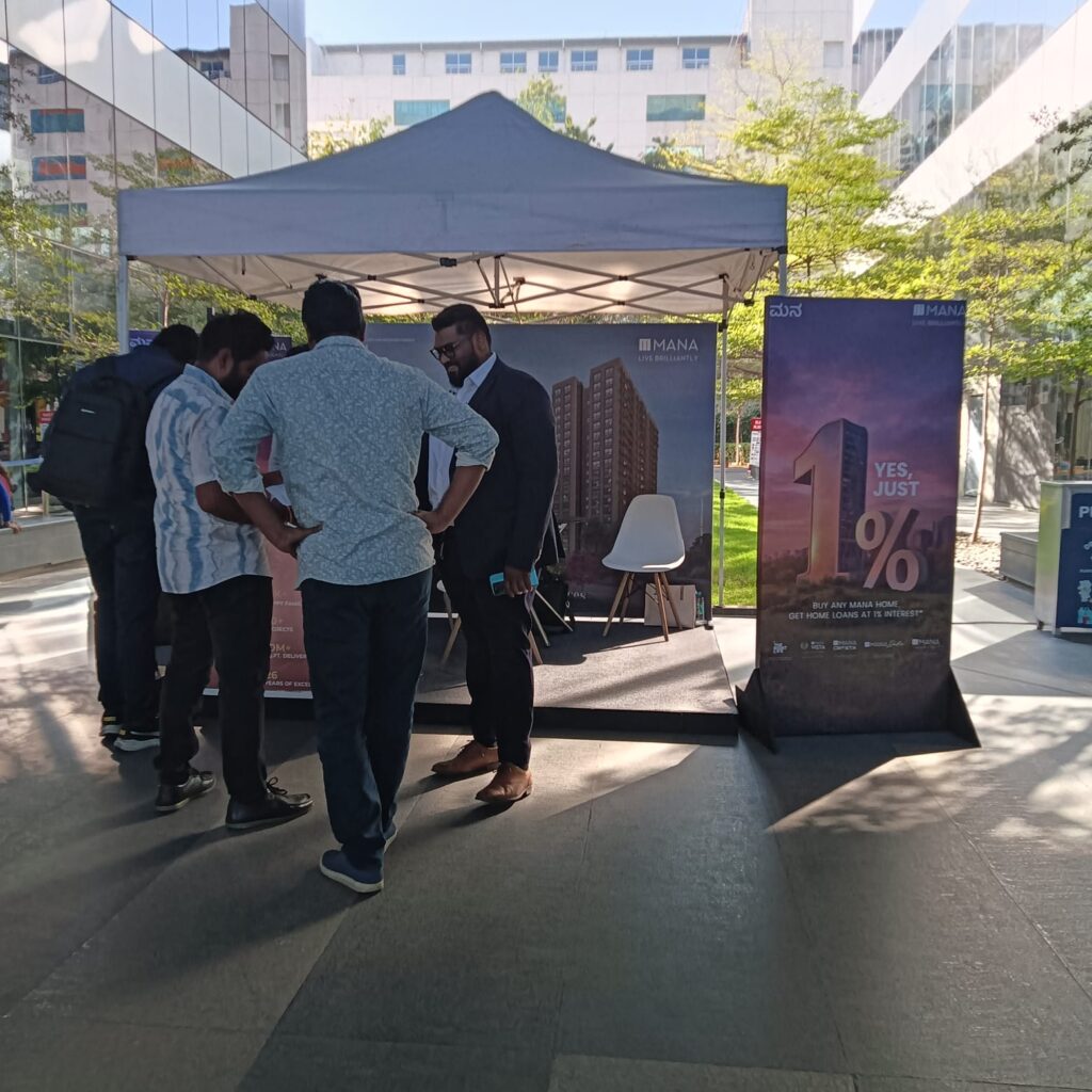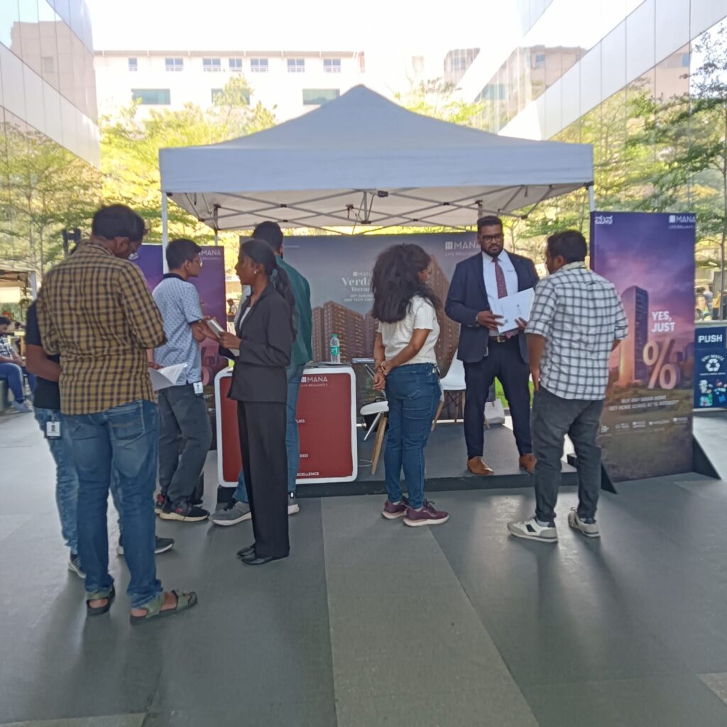 We are specialised in promoting real estate brand , we focused on a very unconventional way of promotion , we understand the boring routine of IT employees , on a busy working days we set up the fun Stand up comedy at their cafeteria sponsored by our client mana group 1 hour of stand comedy at Linkedin office of bellandur as well as surprise gift for employees engaged brand with their target audience instantly